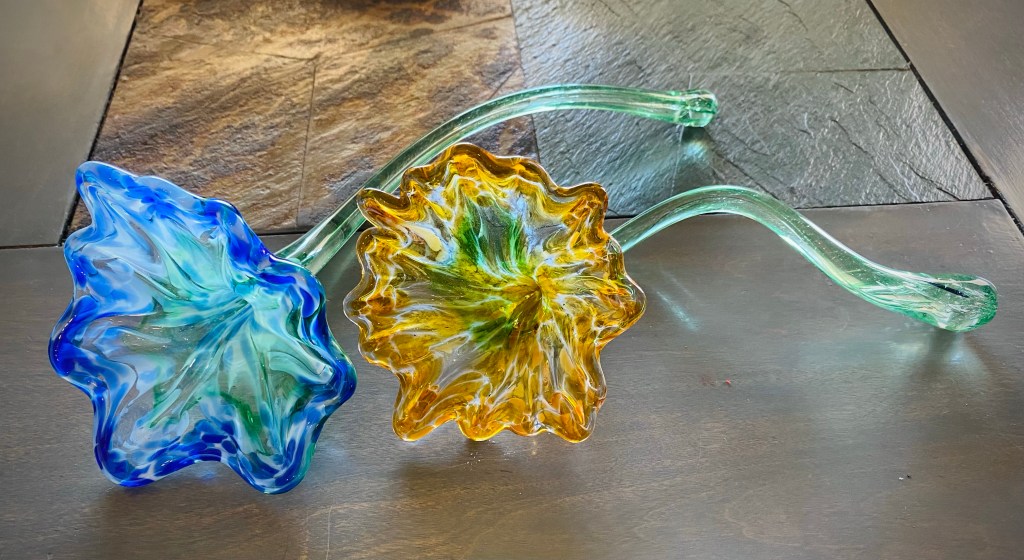 I learned how to collect the molten glass on the steel rod, then how to cool the steel rod, which cools the glass, how to collect the color glass beads into the glass and cook them into the blob to color the glass. Once the glass was colored, I shaped the flowers and the instructor helped me with the stem. When I was happy with how the flowers looked, they were placed in a 950 degree kiln to “cool” slowly. This glass needs to cool very slowly to prevent shattering.